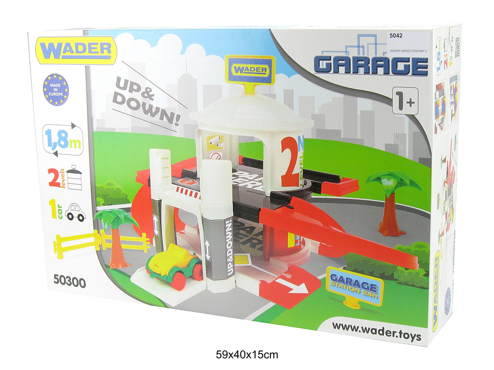 - zestaw składa się z różnokolorowych, łatwych w montażu elementów, z których powstaje trzypoziomowy garaż o wysokości 34 cm oraz zewnętrzna trasa wjazdowa do garażu o długości 1,8 m